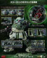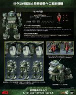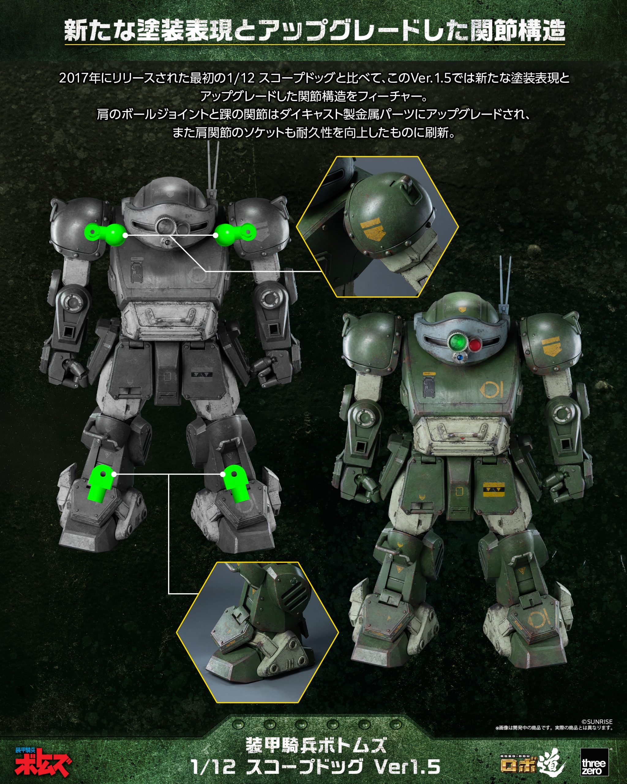 - 2017年にリリースされた最初の1/12 スコープドッグと比べて、この1.5では新たな塗装表現とアップグレードした関節構造をフィーチャー。肩のボールジョイントと踝の関節はダイキャスト製金属パーツにアップグレードされ、また肩関節のソケットも耐久性を向上したものに刷新。