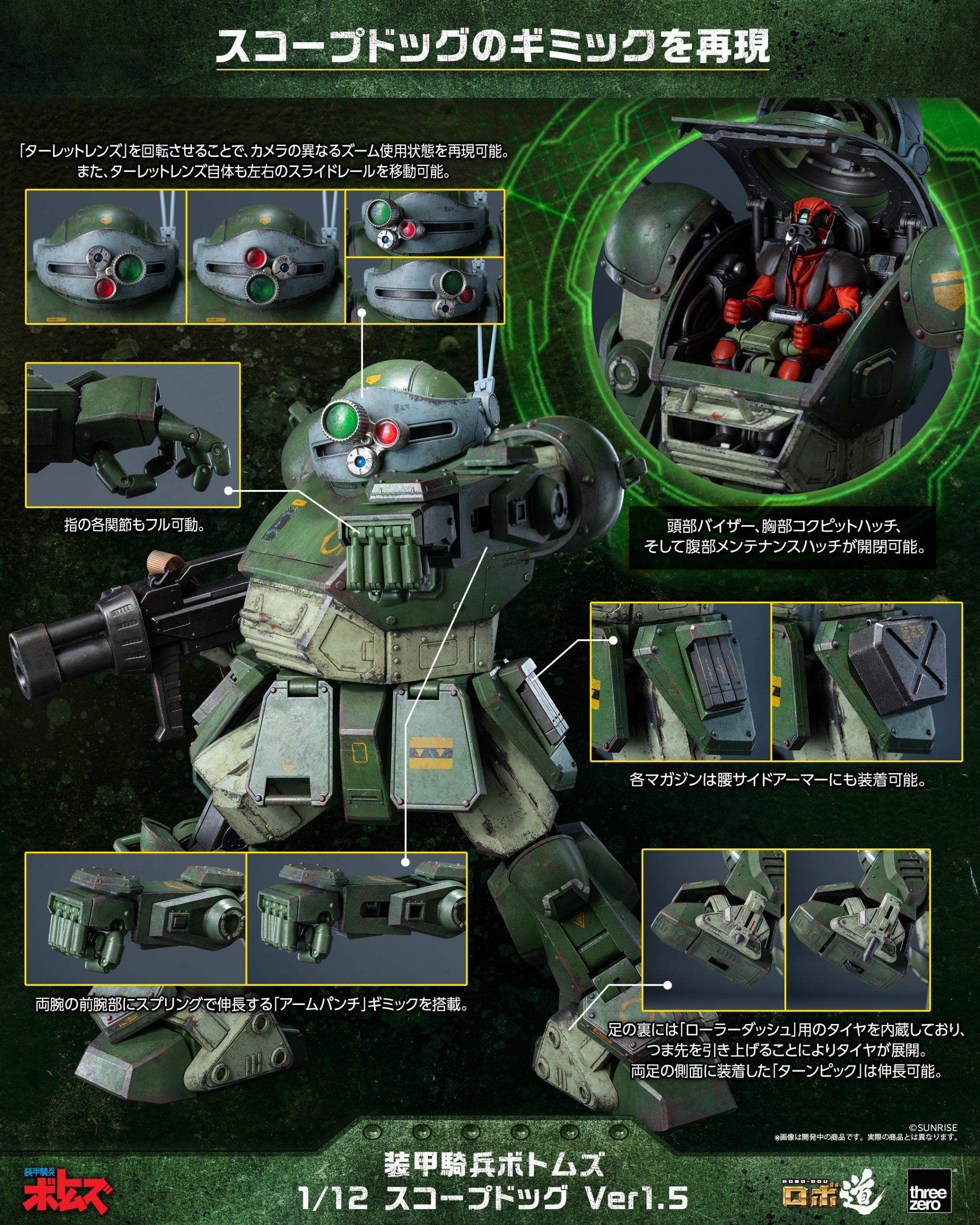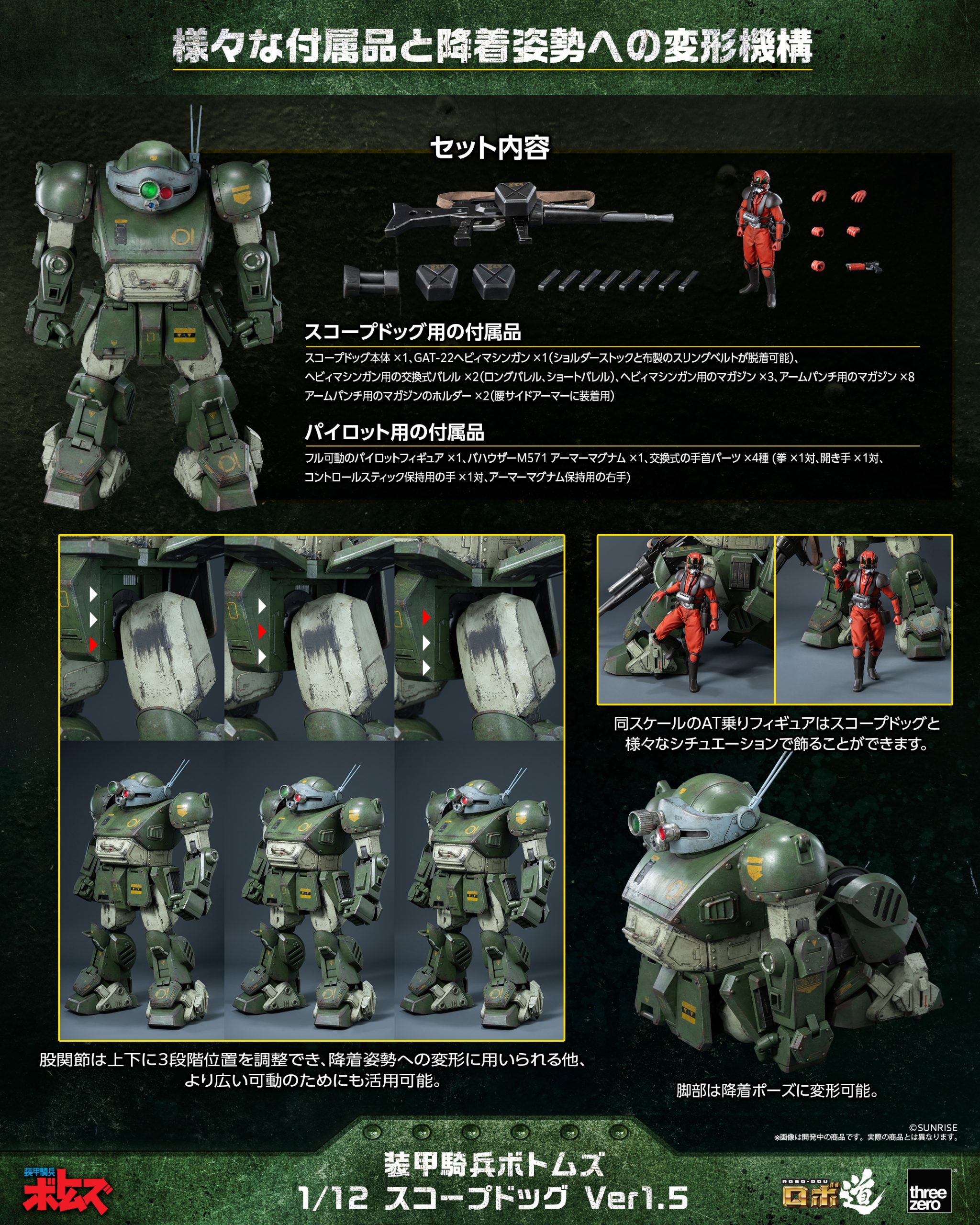 「1/12 スコープドッグ Ver.1.5」は1/12スケールで、高さ約33cm。threezeroが得意とするウェザリング表現を含む精密な塗装が施されており、全身に約100ヶ所の可動ポイントを有するフル可動フィギュアです。コクピットを露出させるにあたって、頭部バイザー、胸部コクピットハッチ、そして腹部メンテナンスハッチが開閉可能。コクピットシートにはAT乗り(パイロット)の可動フィギュアを着席できます。バイザー部の「ターレットレンズ」は回転でき、カメラの異なるズーム使用状態を再現可能。両前腕部はスプリングによって伸長するギミックを搭載し、「アームパンチ」での攻撃が再現できます。手は指の各関節がフル可動仕様です。足の裏には「ローラーダッシュ」用のタイヤが内蔵されており、つま先を引き上げることでタイヤが展開します。両足の側面に装着した「ターンピック」も伸長可能です。さらに、脚部を変形させての降着姿勢が再現可能です。股関節は上下に3段階位置を調整でき、降着姿勢への変形に用いられる他、より広い可動のためにも活用できます。
