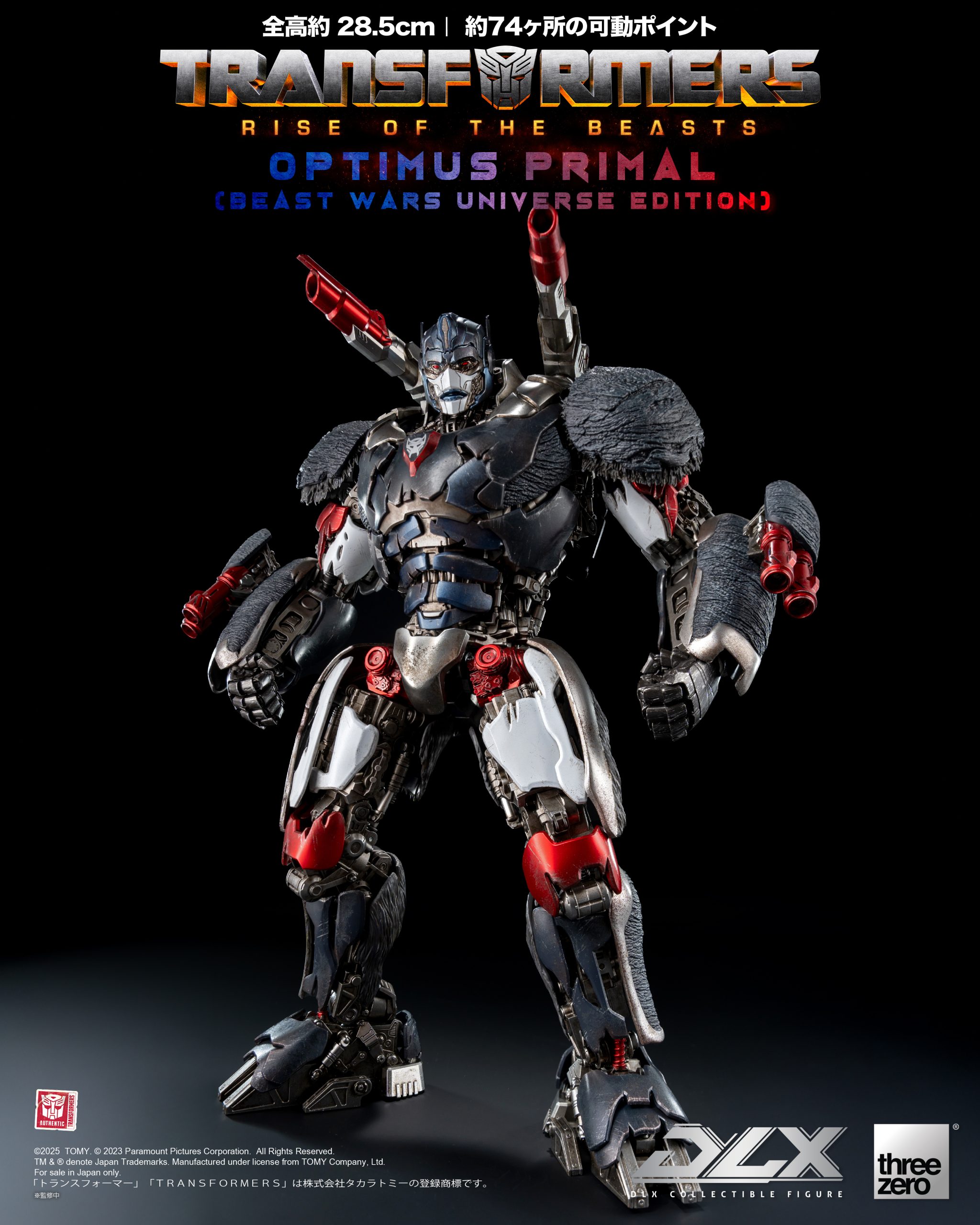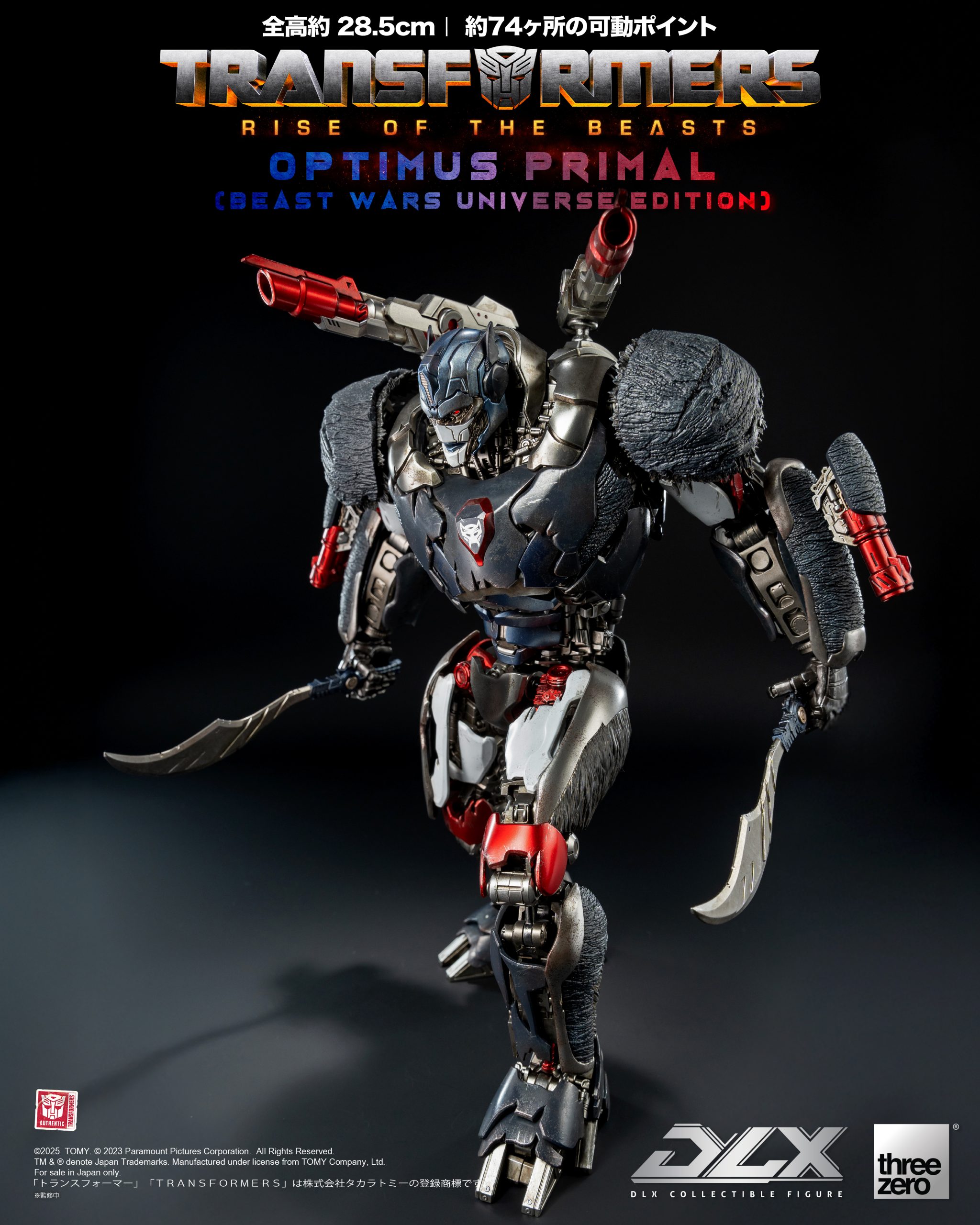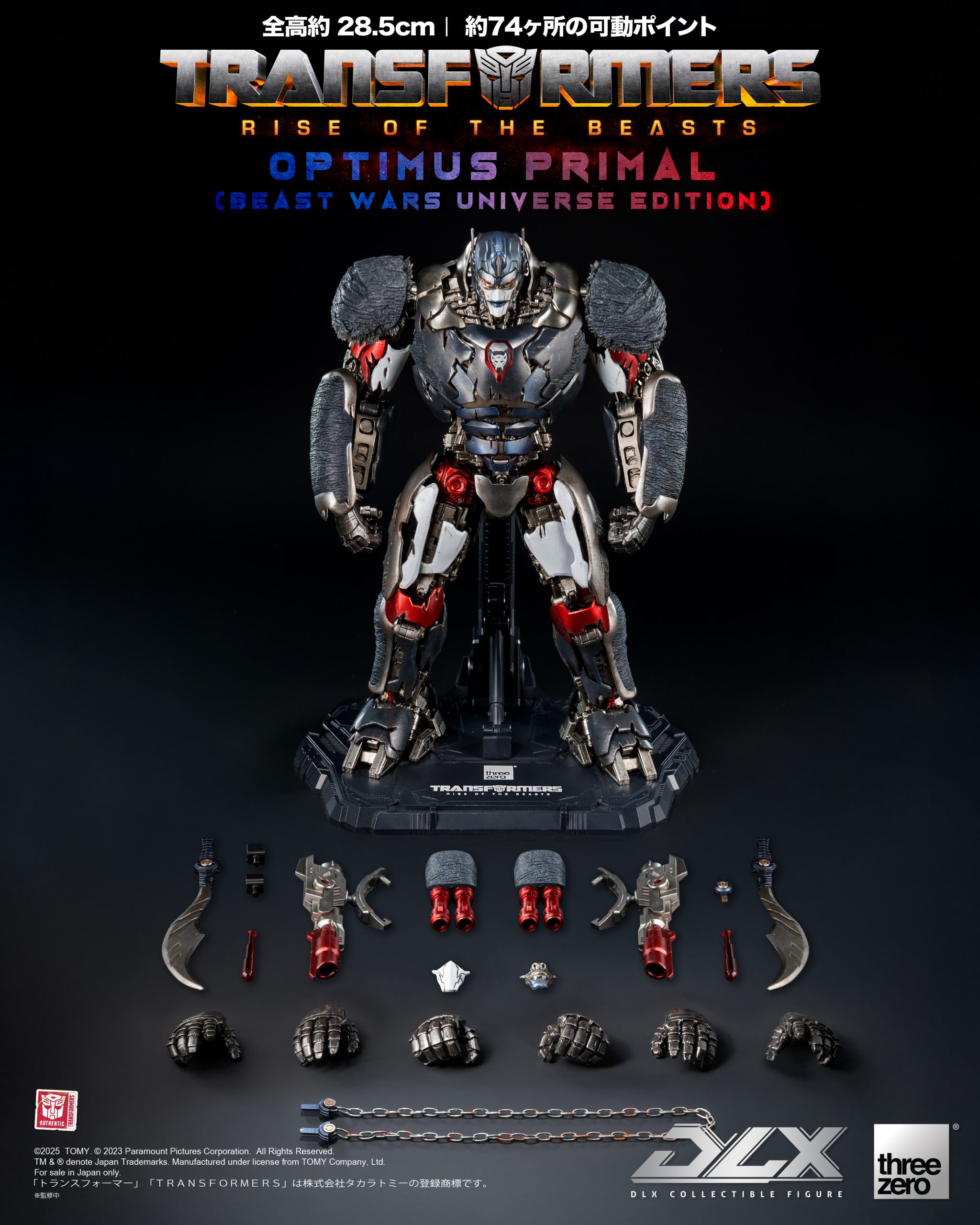 「DLX オプティマスプライマル(ビーストウォーズユニバースエディション)」はダイキャスト製金属を用いたフレームにより、全身の可動ポイントはシリーズ最多の約74ヶ所を実現。胴体、腕、そして脚にあるアクチュエーターシリンダーは実際に可動します。ウェザリング表現を含む精密な塗装が施されています。肩アーマーの特徴的な毛皮は軟質PVCで再現。頭部のマスクパーツは交換式のものが全3種類付属します(口が閉じたバトルマスク、口が開いたバトルマスク、バトルマスク無しの顔)。目にはLED発光機能を搭載。武器として、特徴的なサイバーブレードが2本付属。サイバーブレードはコネクターを介して1本に合体できる他、付属の金属チェーンを介しての接続も可能。交換式の手首パーツが全4対とDLXアクションスタンドが1個付属し、劇中の様々なシーンが再現できます。