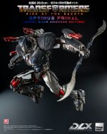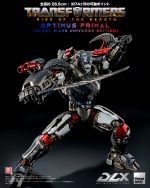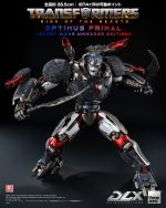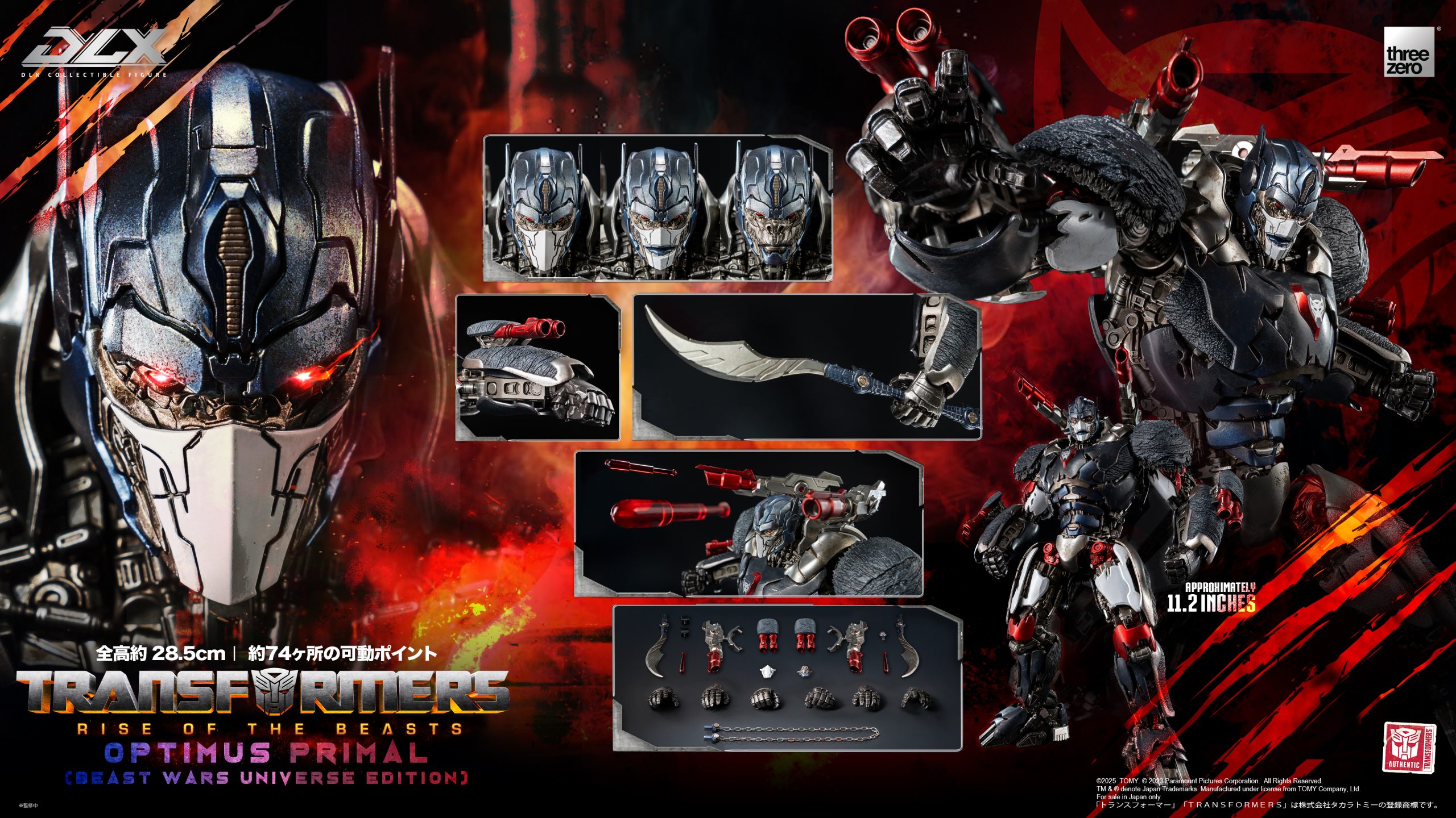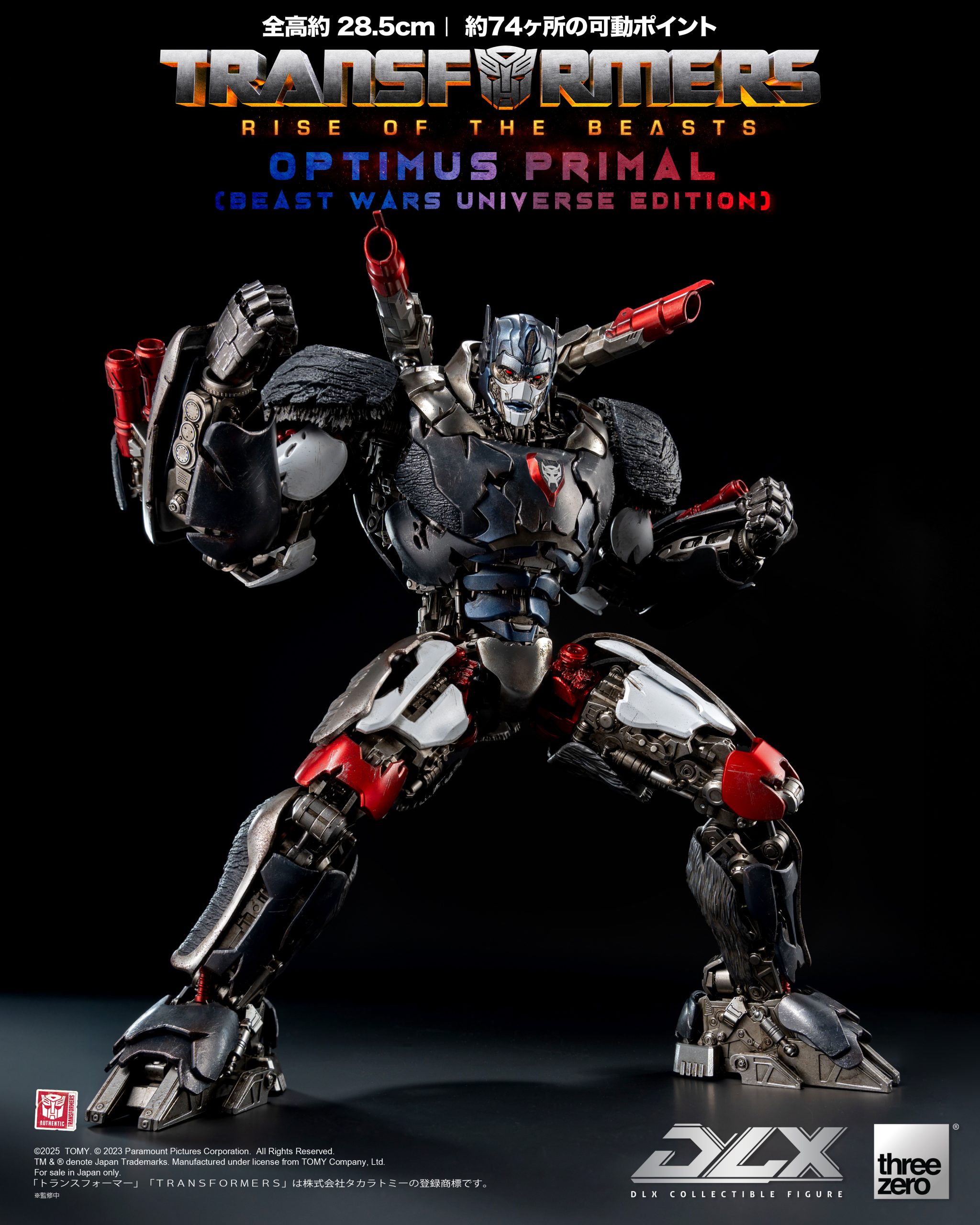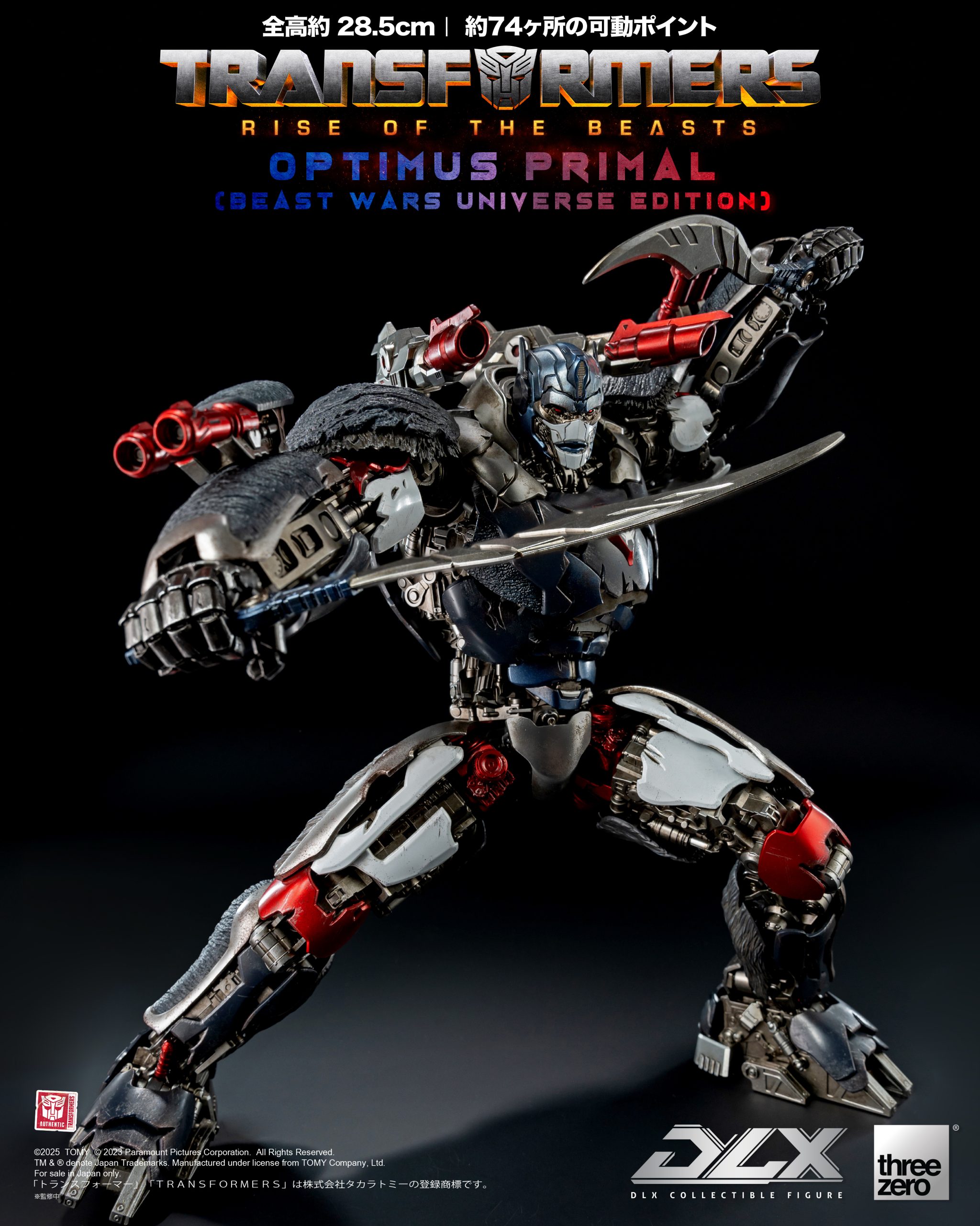 「DLX オプティマスプライマル(ビーストウォーズユニバースエディション)」はダイキャスト製金属を用いたフレームにより、全身の可動ポイントはシリーズ最多の約74ヶ所を実現。胴体、腕、そして脚にあるアクチュエーターシリンダーは実際に可動します。ウェザリング表現を含む精密な塗装が施されています。肩アーマーの特徴的な毛皮は軟質PVCで再現。頭部のマスクパーツは交換式のものが全3種類付属します(口が閉じたバトルマスク、口が開いたバトルマスク、バトルマスク無しの顔)。目にはLED発光機能を搭載。武器として、特徴的なサイバーブレードが2本付属。サイバーブレードはコネクターを介して1本に合体できる他、付属の金属チェーンを介しての接続も可能。交換式の手首パーツが全4対とDLXアクションスタンドが1個付属し、劇中の様々なシーンが再現できます。