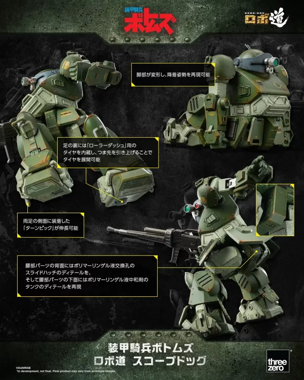 「ロボ道 スコープドッグ」は高さ約14.6cm。ノンスケールながらもミッド級アーマードトルーパーとして、リリース済みのヘビィ級アーマードトルーパー「ロボ道 ラビドリードッグ」(高さ約15.9cm)とのサイズ違いを再現。素材にABS、PVC、POM、そして亜鉛合金ダイキャストを使用したフル可動フィギュアです。亜鉛合金ダイキャストは可動フレームに用いており、これにより全身に合計76ヶ所の可動ポイントを実現。threezeroの得意とするウェザリング表現を含む精密塗装が施されています。