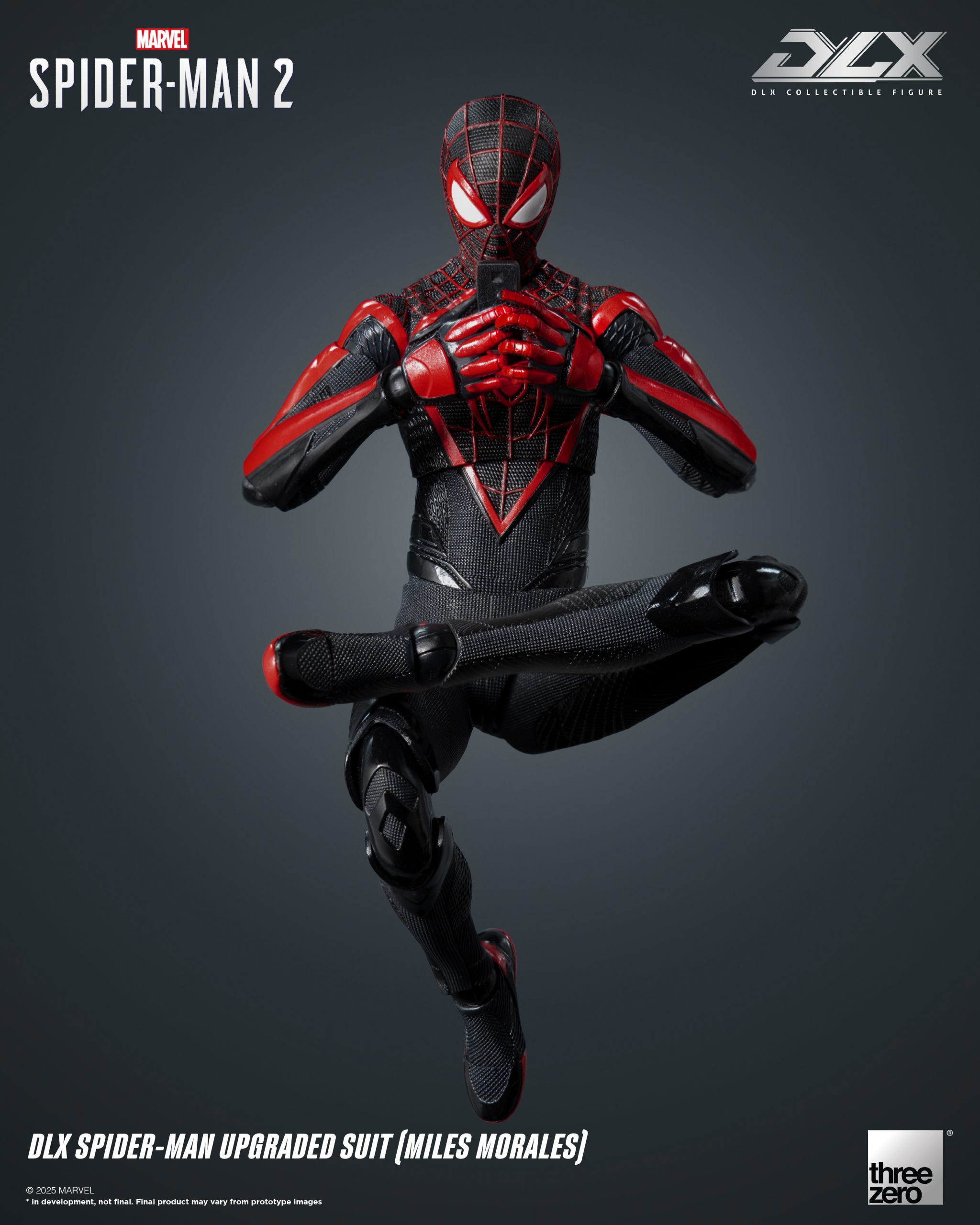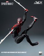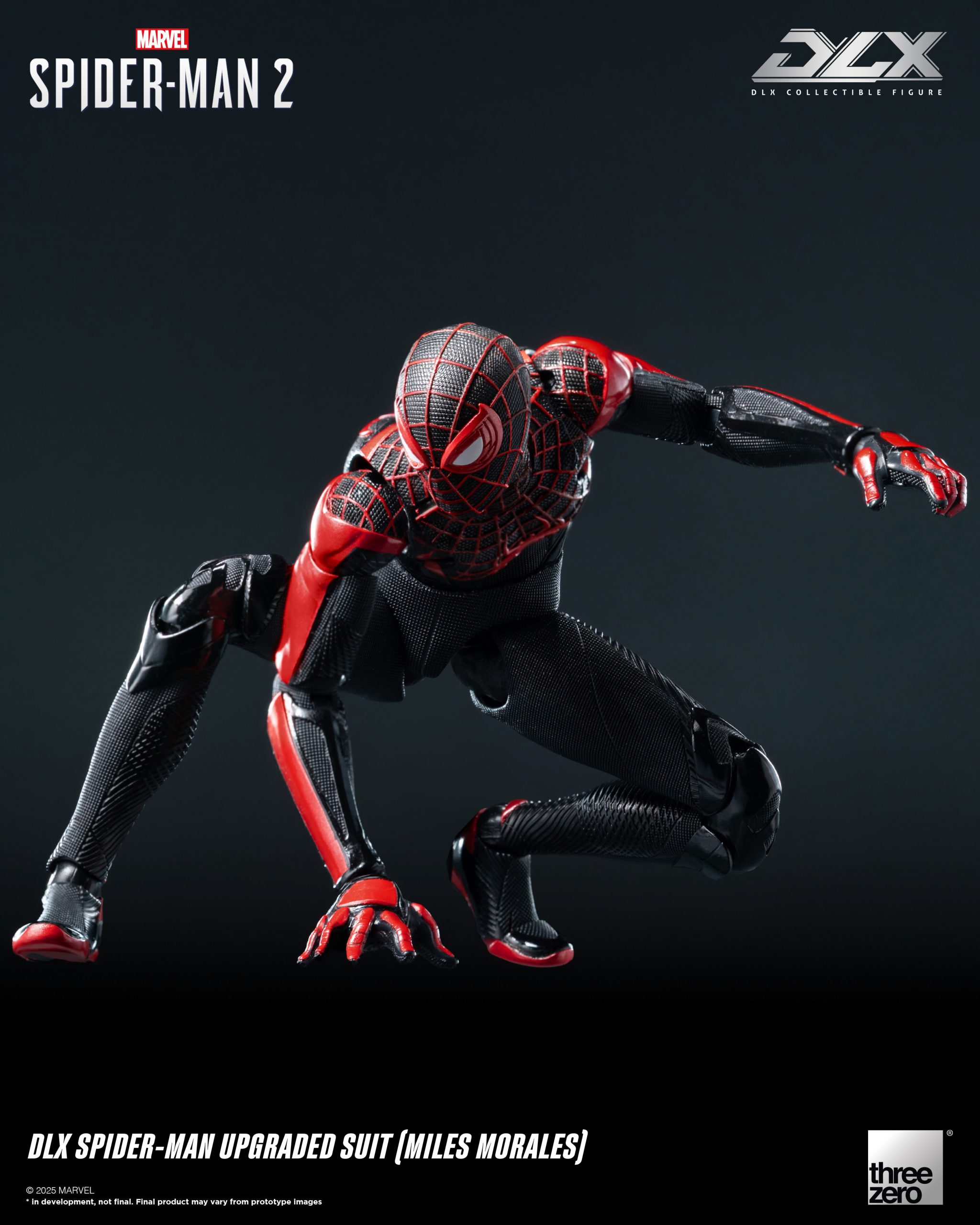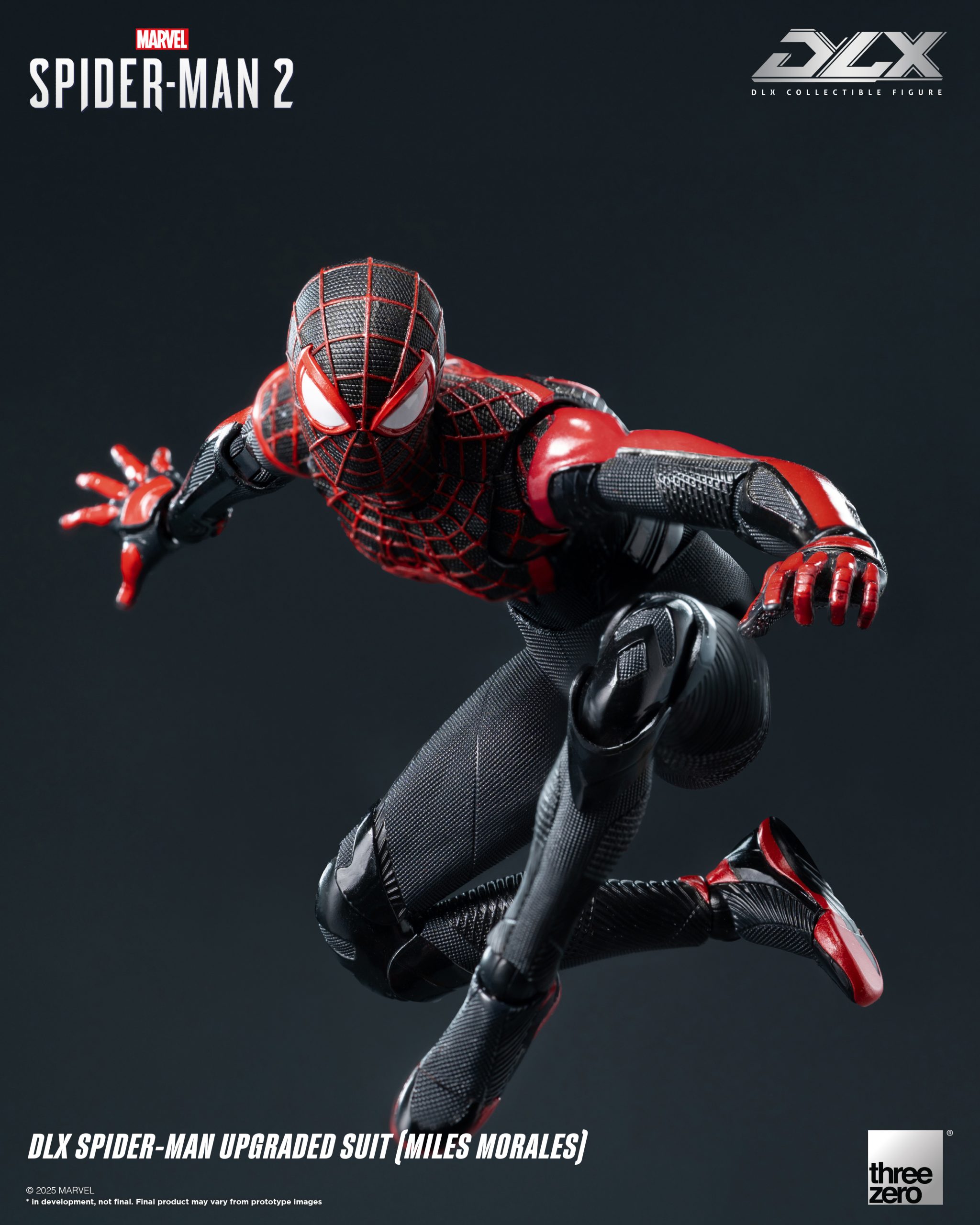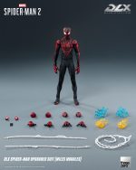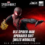 DLX 蜘蛛侠升级战衣(迈尔斯·墨拉莱斯)身高约15.7厘米,采用threezero独特设计的合金配搭工程塑料骨架,具备约39个可动关节;部分关节部件采用合金制成,拥有高可动及耐用度。人偶身上带有饱满而立体的肌肉线条,贴身衣亦雕刻有不同的布纹,呈现游戏中丰富的布纹材质。黑色的战衣辅以红色的纹路及立体网格花纹,胸口和背上的巨大红色蛛纹亦得以重现,细腻还原《漫威蜘蛛侠2》中的形象外观。