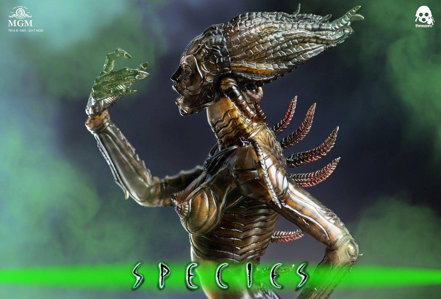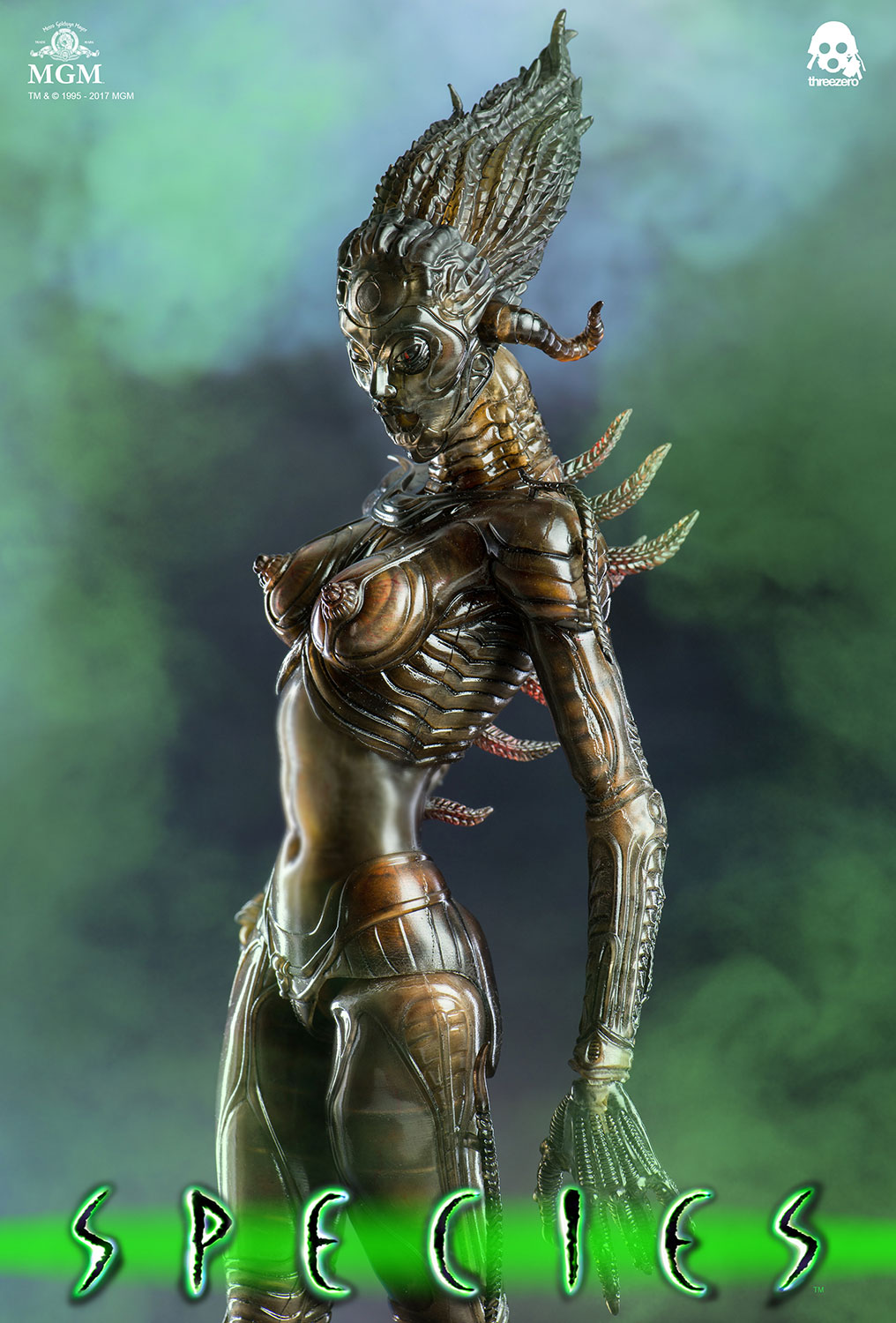 《异种》Species Sil 1/6 可动人偶以1995年 Legendary H.R.Giger 设计的异种生物武器为蓝本,以精湛工艺将异种独特的外观完美还原。可动人偶身高约13.7“(〜35厘米);柔软半透明的PVC包胶透出躯干,手臂和腿部的肌理细节及骨骼结构,配有恐怖逼真的专用地台。