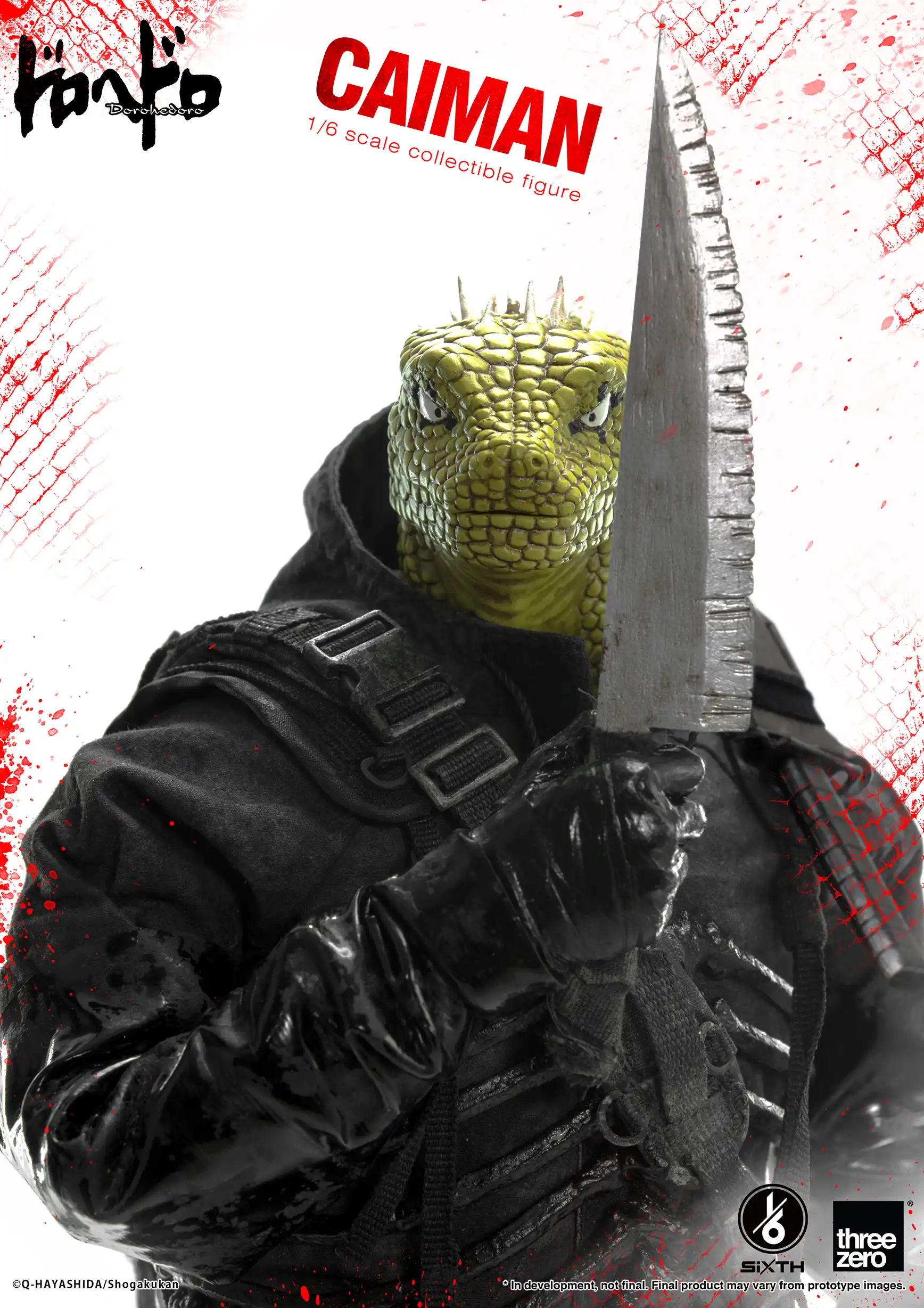 1/6 開曼(Caiman)人偶擁有約30個可動關節;全高約36厘米,以1/6比例還原故事中超出210厘米的巨大身材。使用材料包括PVC、ABS、POM及服飾用織物。服飾採用了舊化塗裝,營造出灰塵及淤泥般的效果。
