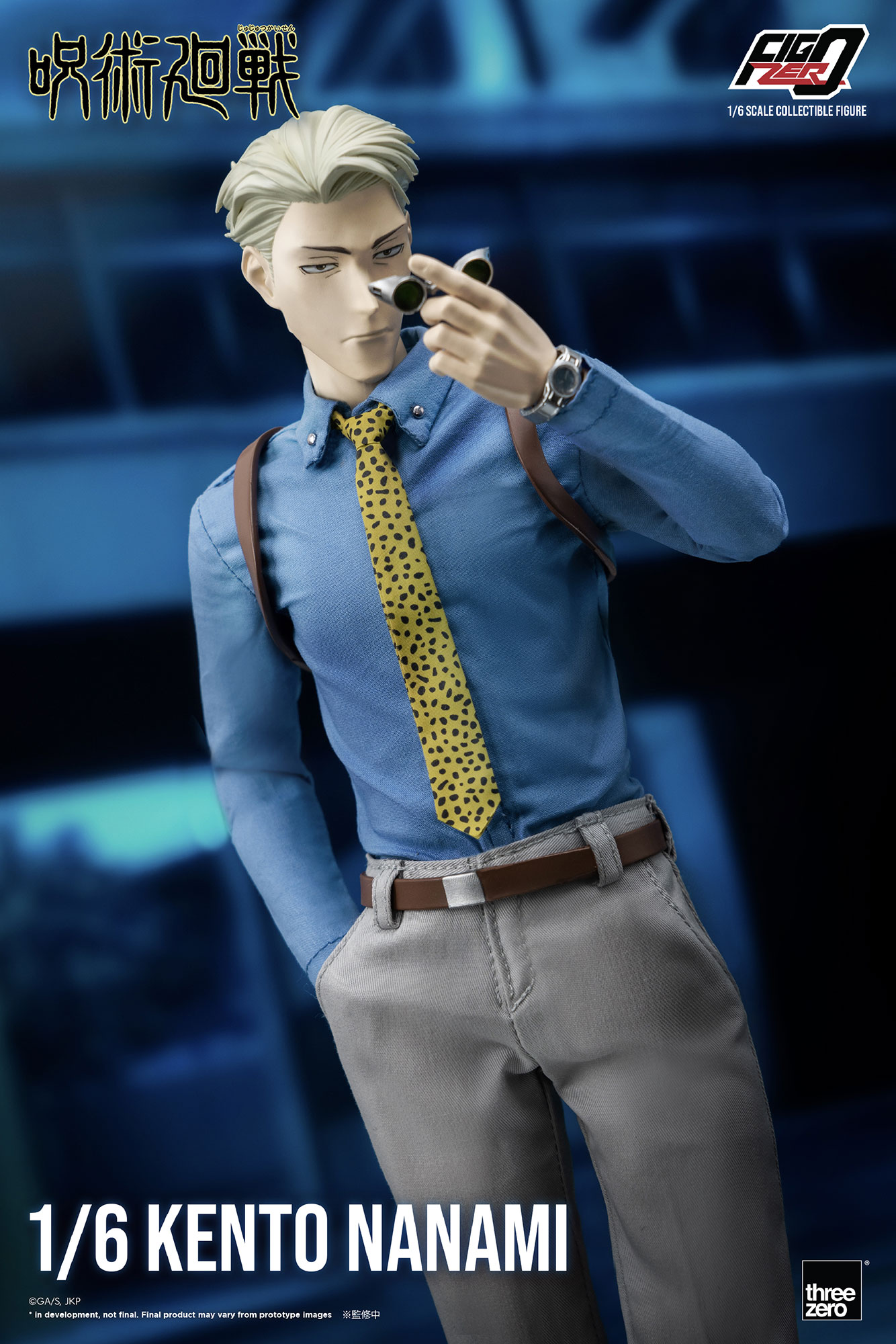 FigZero 1/6 七海建人身穿一件布長袖襯衫,外搭一套布西裝外套及長褲、一條布領帶、布襪、皮帶和一對鞋。產品附帶五組可互換的手。其他配件包括一副含磁石的墨鏡*、一隻腕錶、一把咒具鉈刀、一條背帶和一個右拳咒術特效配件。